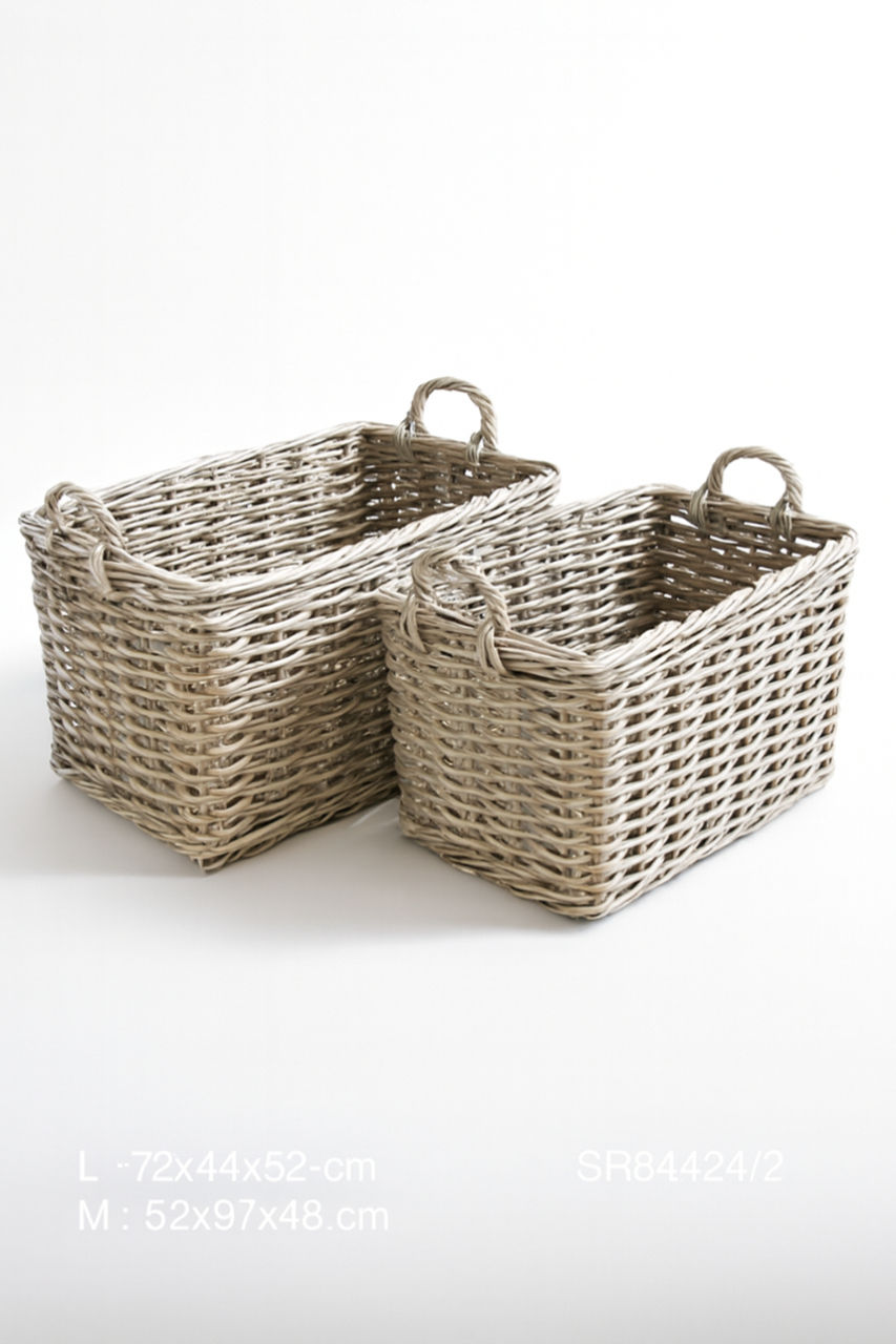 Hand-Woven Kubu Rattan Large Rectangular Basket Set with Handles – Set of 2