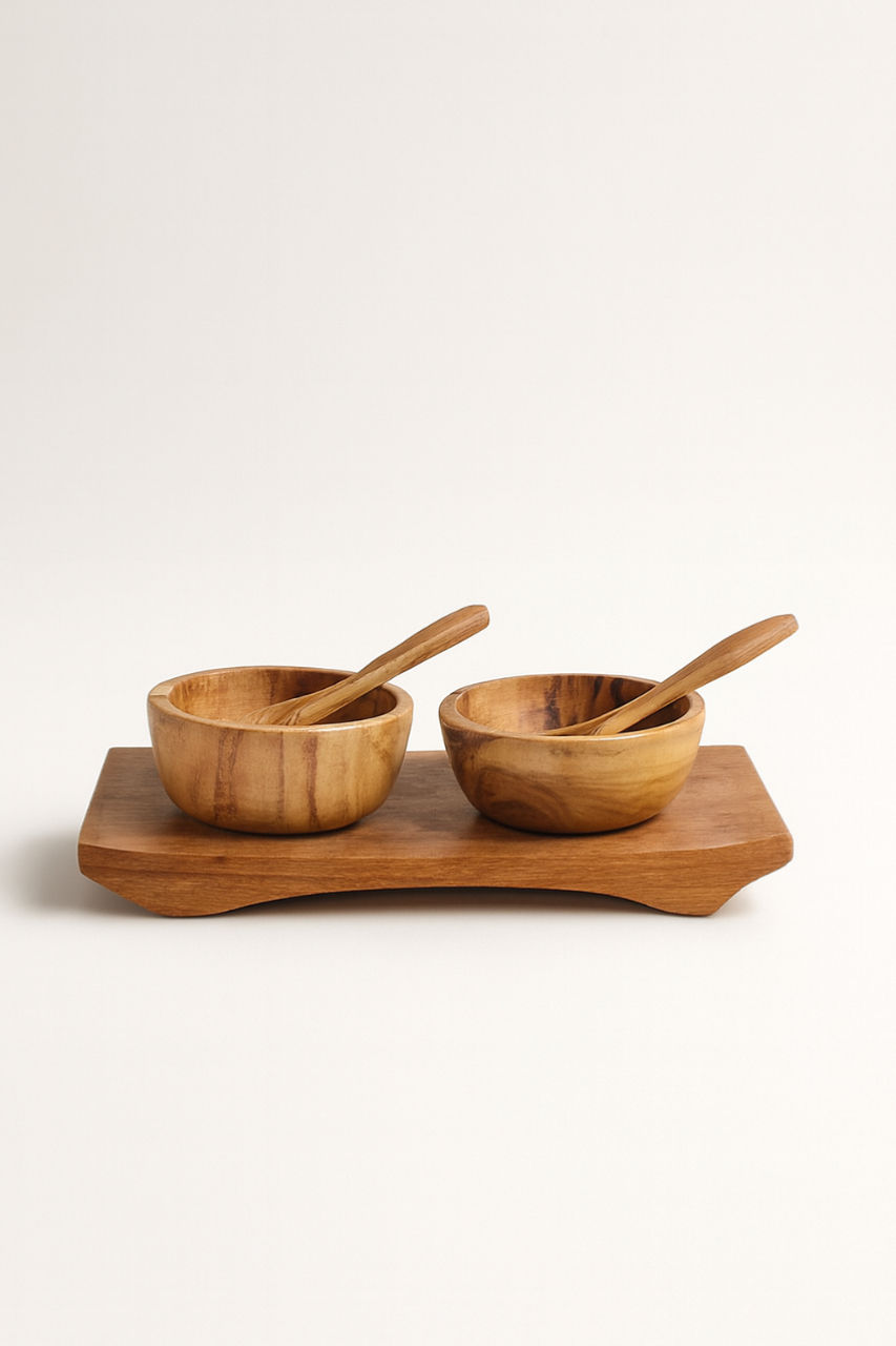Solid Teak Condiment Bowls on Teak Base with Spoons – Set of 2 (Pack of 4)